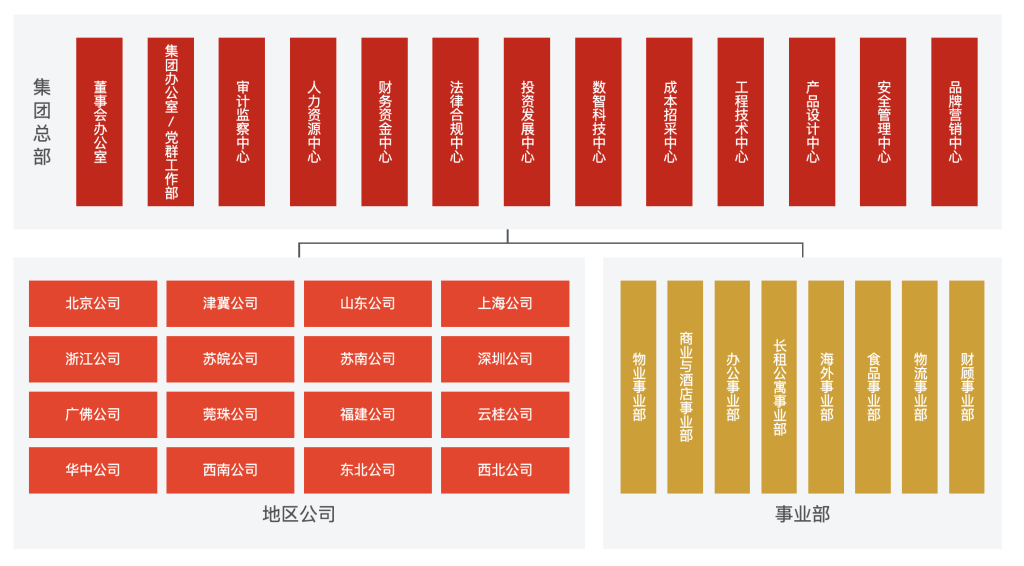 根据最新的组织架构,万科集团总部除了董事会办公室、集团办公室/党群工作部外,还设有投资发展中心、成本招采中心、工程技术中心、产品设计中心等11个中心;地区公司分为北京公司、津冀公司、山东公司、上海公司等16个公司;原物业事业集团(BG)等统一归为事业部,目前包含物业、商业与酒店、办公、长租公寓、物流等八大多元化业务。