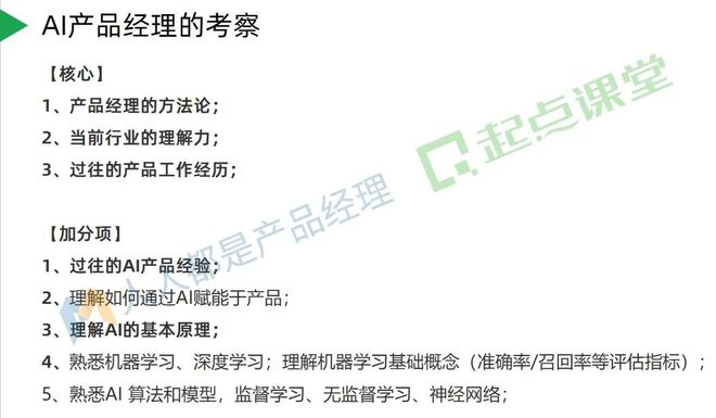 ①产品建设能力:产品经理的基础,很多公司BC端业务并行,AI产品经理要有具备基本的产品落地能力,才能独立统筹一个AI产品项目。