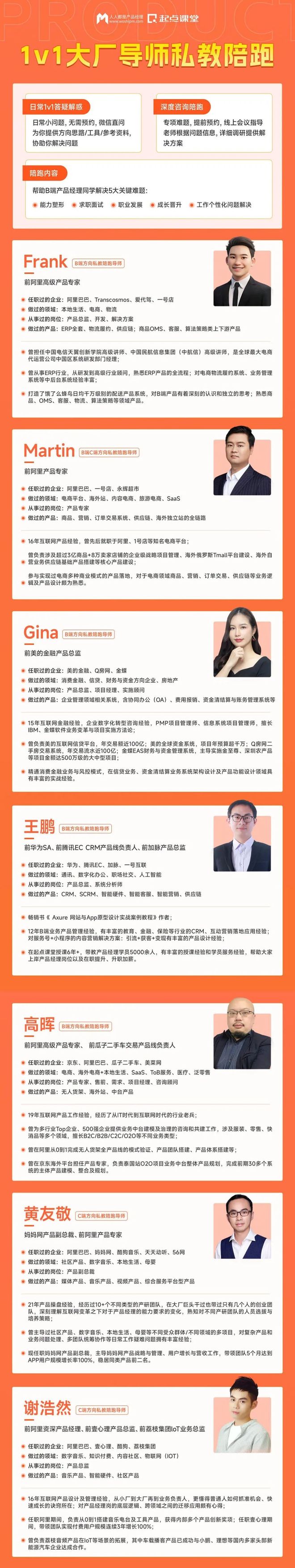整个陪跑计划特邀多位10年+经验的大厂导师1v1陪跑。老师目前也还在一线业务上做产品,主导公司产品AI化项目,掌了握前沿业务实践经验,无保留分享。