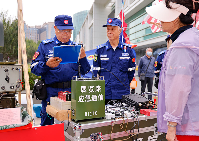 活动现场,西城区合力减灾中心开展了模拟实战的防空袭掩蔽演练,现场教授辖区群众在紧急情况下如何快速、有序、安全地进行掩蔽防护。活动现场还邀请了西城区武装部、区反恐办、区红十字会、展览路街道无线电团队等相关单位参与,结合各自工作职能现场“摆摊宣传”,通过装备设备展示、互动体验、现场教学培训等形式,向参与人群科普展示设备、专业知识、技能演练、法律法规等内容,提高市民应急能力。