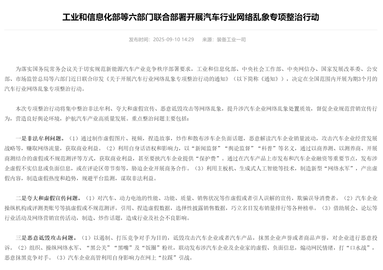 9月10日,工信部等六部门联合印发《关于开展汽车行业网络乱象专项整治行动的通知》(以下简称《通知》),决定在全国范围内开展为期3个月的汽车行业网络乱象专项整治行动。